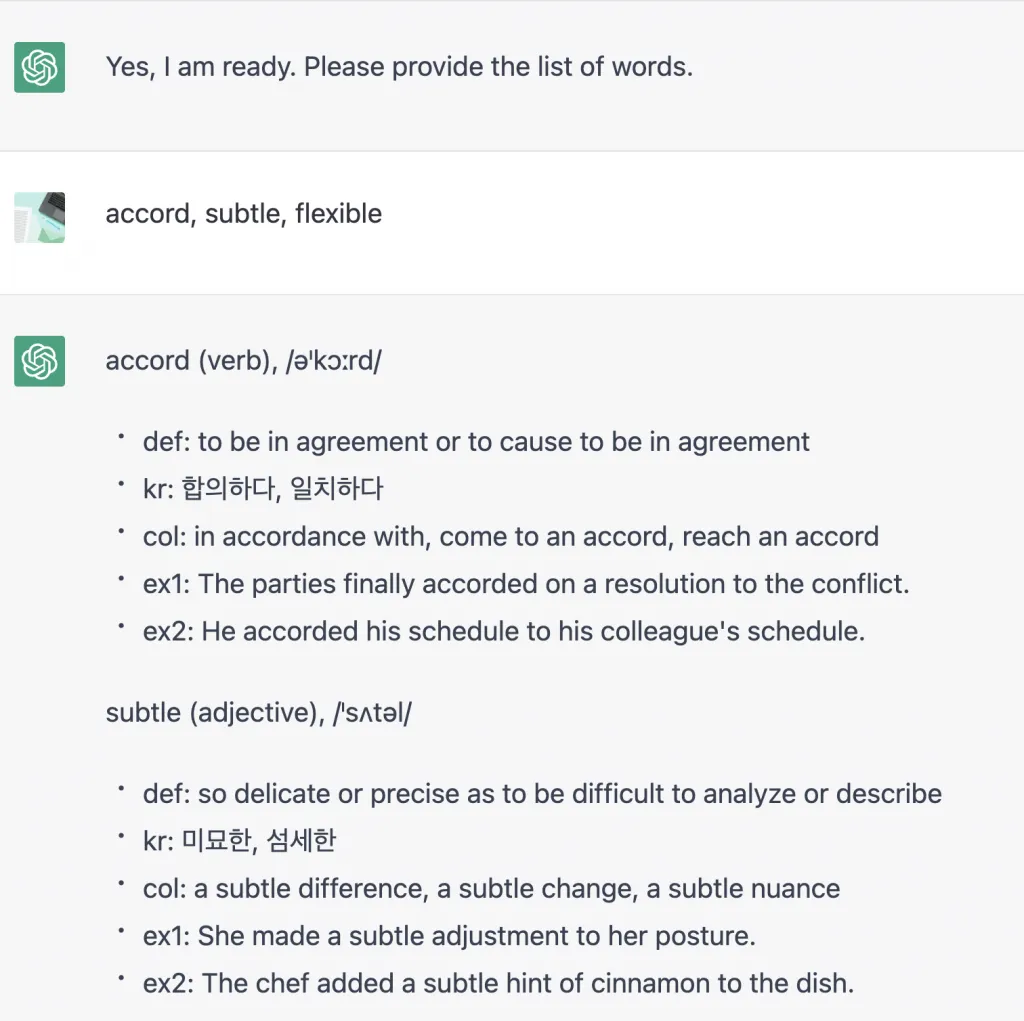 영어 단어 자료집 만들기 프롬프트에 대한 결과 예제