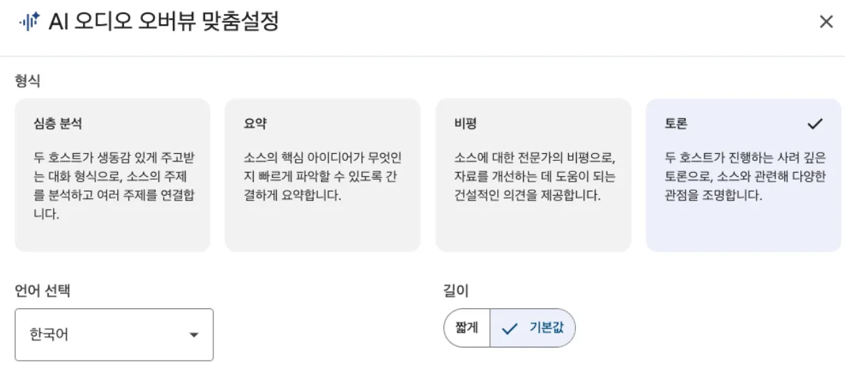 - 심층 분석 (Deep Dive, 기본) - 두 호스트가 생동감 있게 주고받는 대화 형식으로, 소스의 주제를 분석하고 여러 주제를 연결 (a through examination of your sources).
