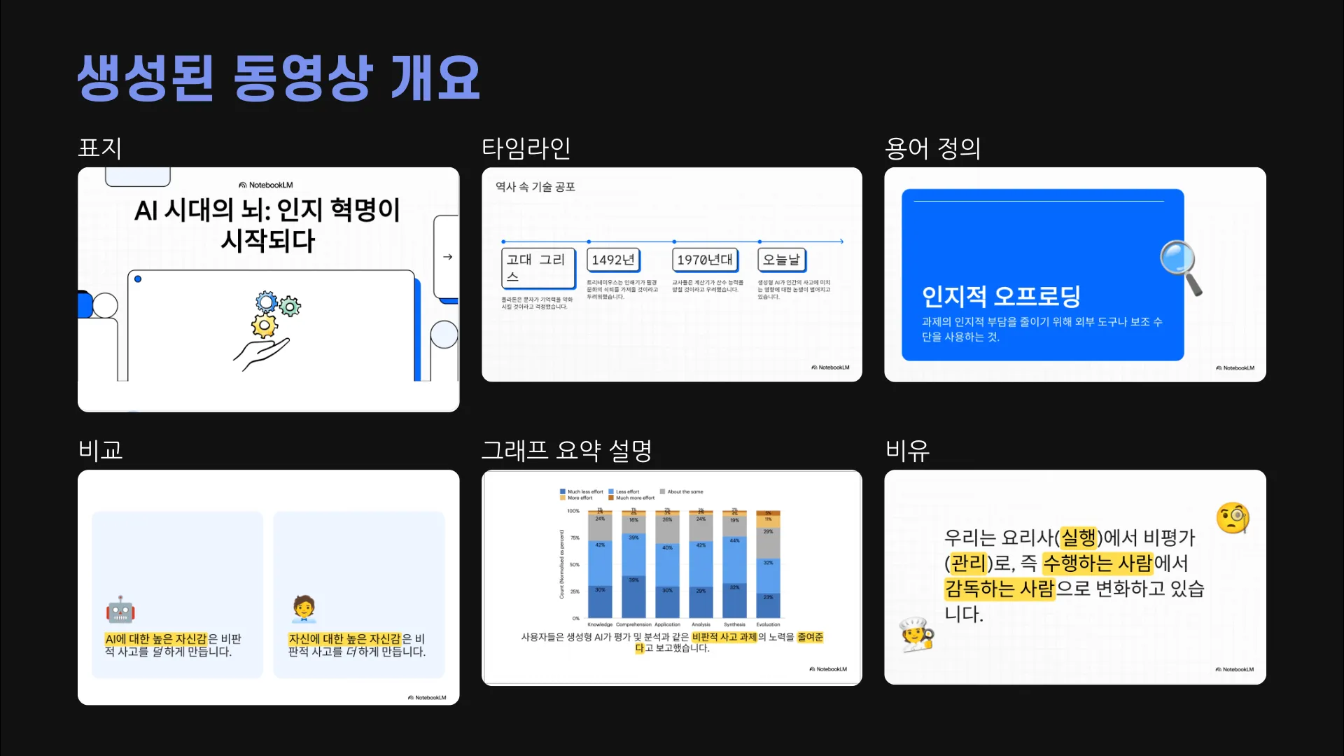 NotebookLM의 비디오 오버뷰는 노트북 콘텐츠를 영상 프리젠테이션으로 자동 변환해준다. 이 기능은 한국어를 포함한 80여 개 언어로 지원되며, 복잡한 자료를 시각적으로 요약해준다. 다음은 생성된 비디오 오버뷰의 일부 스크린샷들이다. 자세한 내용은 다음 링크를 통해서 직접 확인할 수 있다.
